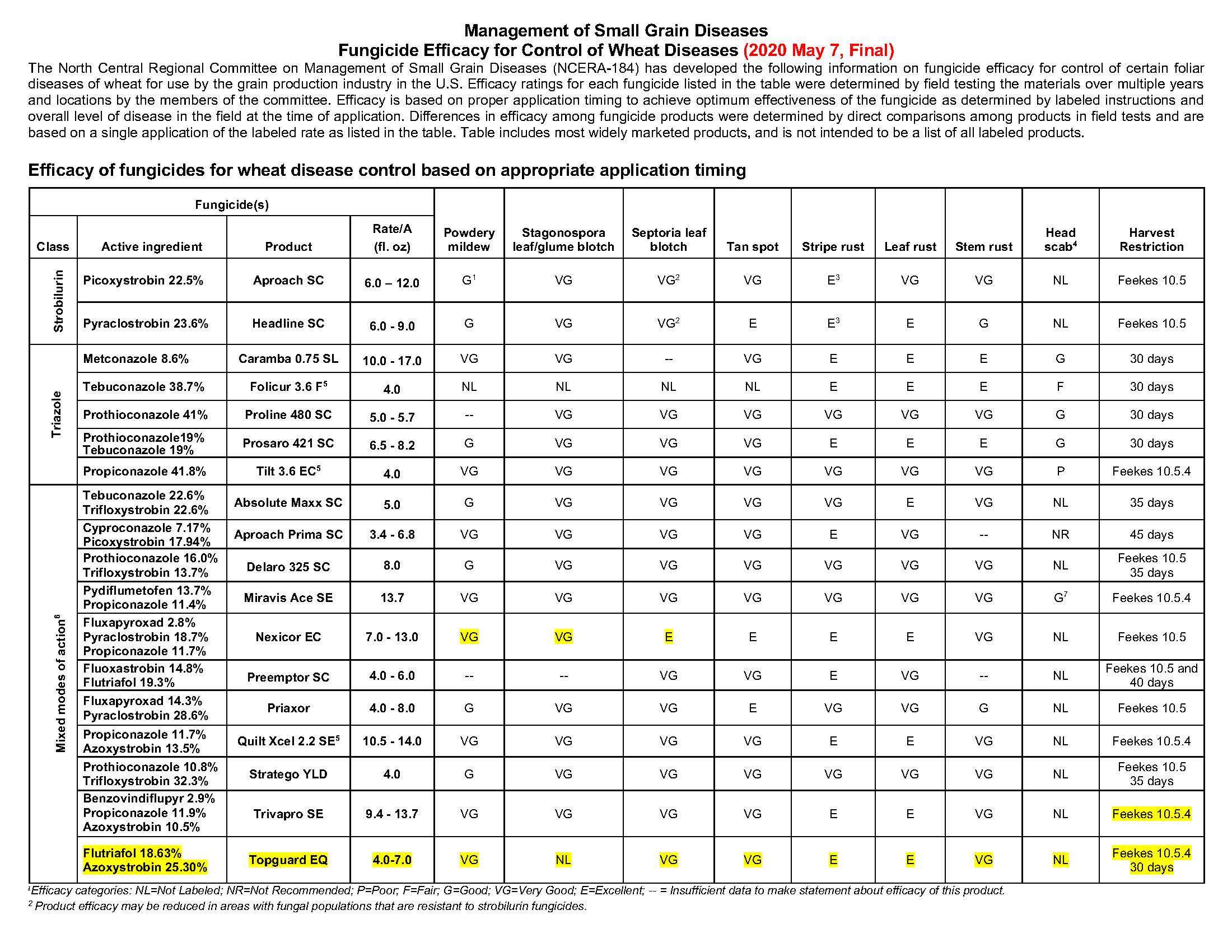 For the fungicides listed in two categories of latest application (such as Delaro 325 SC, Preemptor SC, Stratego YLD, and Topguard EQ), the one comes first should be considered as the restriction. Some of the above listed fungicides, such as Folicur, Tilt, and Quilt Xcel, there are different commercial names, check the active ingredients. Folicur contains 38.7% Tebuiconazole. Tilt contains 41.8% Propiconazole. Quilt Xcel contains 11.7% Propiconazole and 13.5% Azoxystrobin.