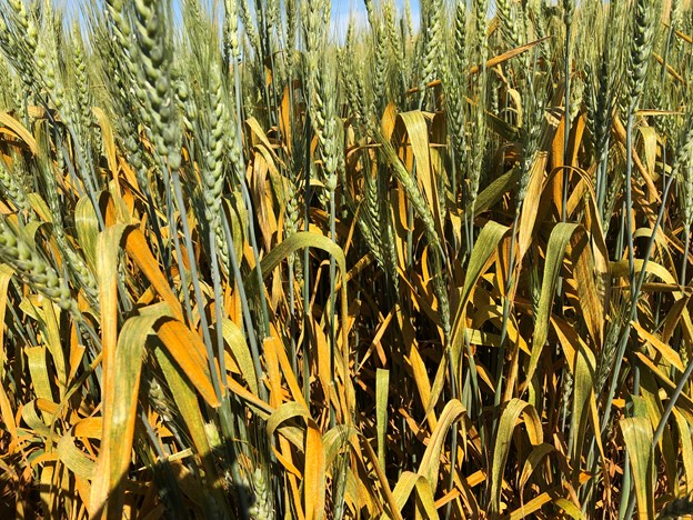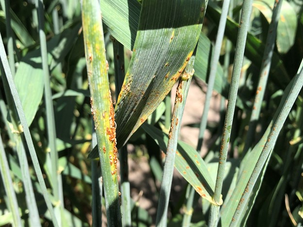 Winter wheat has reached maturity, and harvest has started in central and south-central Washington. In the Palouse region in eastern Washington and northern Idaho, winter wheat ranged from milk to soft dough stages, and spring wheat ranged from flowering to milk. Stripe rust has reached 100% severity on susceptible varieties of spring wheat in our experimental fields in all locations across Washington (Figure 1). Barley stripe rust reached 60-80% severity on susceptible spring barley varieties in all our experimental fields across locations throughout Washington. In the Palouse region, stripe rust infection could be easily spotted in most winter (with green plants) and spring wheat fields, mostly as necrotic stripes that are either resistant reactions or stopped by fungicides, with low severity and incidence of active rust pustules in few fields. Low incidence of stripe rust was found in one spring barley field. In general, stripe rust is under control and the rust season is over.
