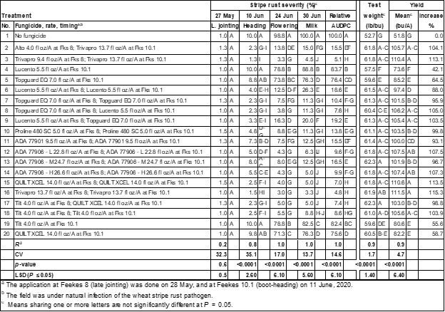 Table 4. Stripe rust severities and relative area under the disease progress curve (AUDPC), test weight, and yield in susceptible spring wheat (‘AvS’) field plots not sprayed (No fungicide) or sprayed with various fungicide treatments under natural infection of the stripe rust pathogen near Pullman, WA in 2020