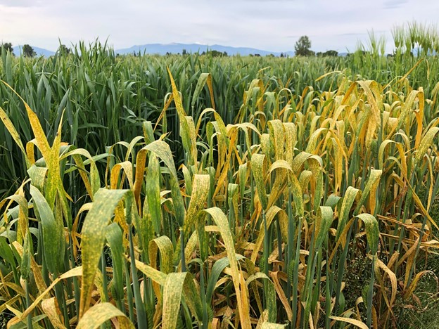 This week, we were taking the second-time stripe rust notes of the winter cereal nurseries and the first-time notes of spring cereal nurseries in Mount Vernon (Skagit County) in western Washington. Winter cereals ranged from boot (Feekes 10) to flowering (Feekes 10.5), and spring plants were in early jointing (Feekes 4-5). As usual this time of year in this location, stripe rust was very severe on both winter and spring susceptible wheat varieties. Severities reached 100% on winter wheat (Figure 1) and 80% on spring wheat of susceptible varieties. Although stripe rust was less on barley, severity was up to 80% on susceptible winter barley and 40% on spring barley. No leaf rust was found on wheat, but barley leaf was observed on a couple of winter varieties.