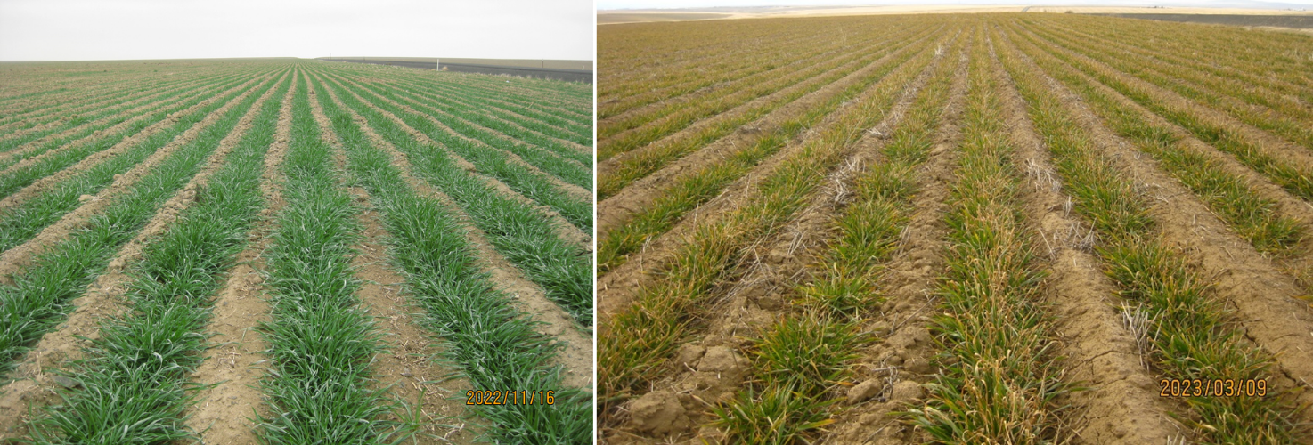 Figure 1. A wheat field in Adams County on November 16, 2022 (left) and a wheat field in Benton County (right), Washington showing winter injury on March 9, 2023.